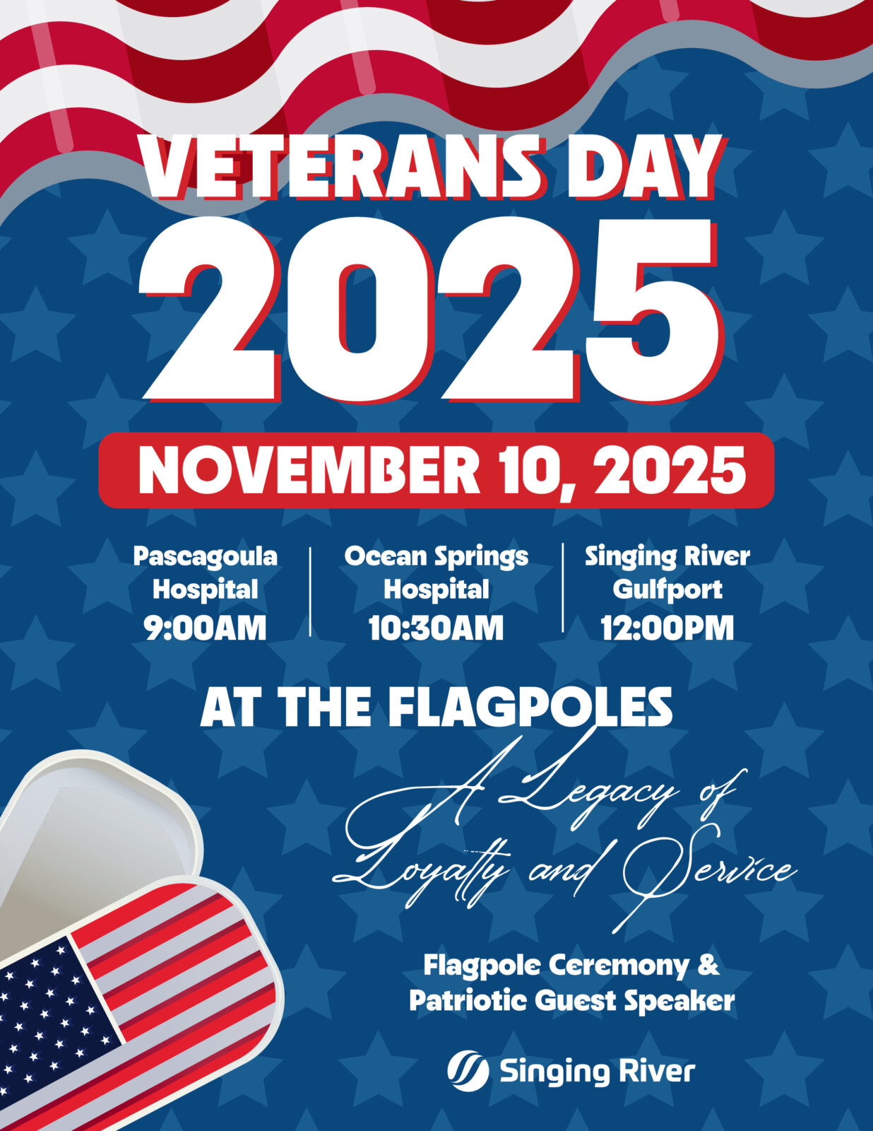 Join us at Pascagoula Hospital at 9AM, Ocean Springs Hospital at 10:30AM, and Singing River Gulfport at 12PM for a flagpole ceremony and patriotic guest speaker in honor of Veterans Day.